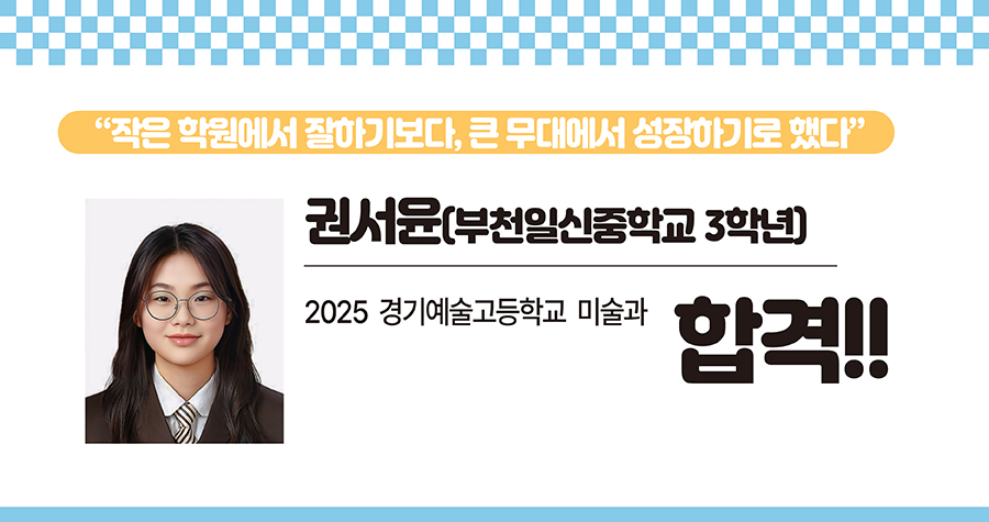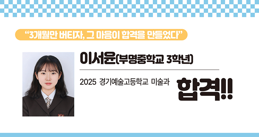 “경기예고 합격 발표를 학교에서 봤어요. 홈페이지에서 접수 번호와 이름을 친 다음 ‘합격’ 단어가 뜬 것을 보고 감격해서 여기저기 자랑하고 다녔죠. 정말 기뻤어요.” 김윤지 학생은 “초등학교 때부터 미술을 좋아했다. 사촌언니가 그림을 좋아했는데 같이 많이 놀면서 미술에 흥미를 갖게 됐다”라며 “시각디자인과 일러스트에 관심이 있고, 예고에서 공부하며 구체적으로 대학의 전공과 미래 직업에 대해 고민할 계획”이라고 말했다. 이어 “초등학교 때 캐릭터 위주로 그림 그리는 것을 좋아해 입시 미술을 하면서 이론과 구도 등 암기해야 할 내용들이 많아 적응하기가 쉽지 않았다”라며 “선생님께서 설명 영상을 촬영해 주셔서 언제든 보며 반복 학습할 수 있어서 도움이 많이 됐다. 특히 부천 클라우드미술학원의 재원생들에게 무료로 공개되는 정보방에서 실기 실력을 향상할 수 있는 정보를 많이 얻었다”고 말했다. 김윤지 학생은 평소 세부적인 표현은 잘하는데 지우개로 너무 많이 지워 입체감이 나지 않는 단점이 있었다. 입체감이 나려면 기본 도형을 이해하고 그려야 한다는 선생님의 조언을 듣고 자료를 찾아보며 꾸준히 노력해 단점을 극복할 수 있었다. 김윤지 학생이 부천 클라우드미술학원에 다니기 시작한 것은 지난해 3월부터이다. 내신 성적이 1등급으로 우수하다. 다른 진로를 생각해 볼 법도 한데 미술을 전공하겠다는 생각을 바꾼 일이 없다고. 윤지 학생은 “그림을 그리다보면 슬럼프가 올 때가 있는데 성적 관리가 되어 있어서 합격할 수 있다는 자신감을 잃지 않고 더 열심히 실기 연습을 할 수 있었다”고 말했다.2023