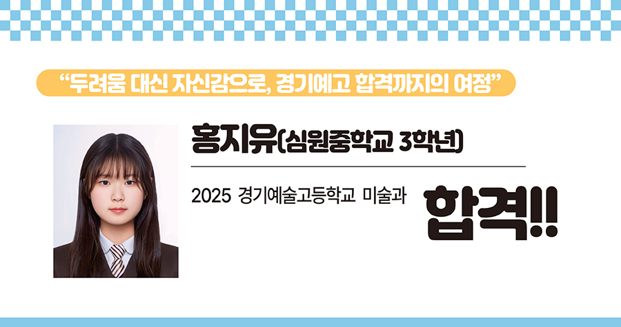 시험을 준비하는 후배들에게 꼭 해주고 싶은 말이 있습니다. 시험을 두려워하지 말고, ‘내 그림을 심사위원에게 자랑하러 간다’는 마음으로 임했으면 좋겠습니다. 학원에서 배운 걸 믿고, 즐겁게 그림을 그 다면 좋은 결과는 분명히 따라올 거예요. 무엇보다 자신을 믿고 “나는 붙는다!”라는 마음가짐으로 끝까지 밀어붙이세요.