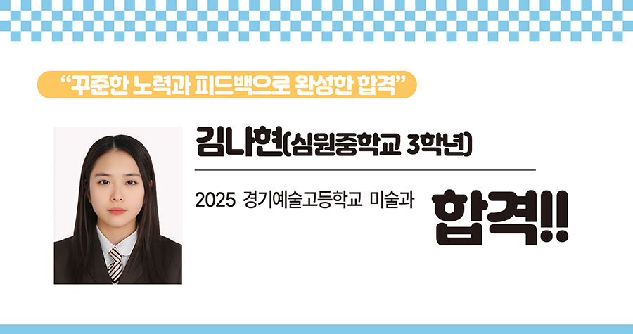 “의정부의 금오중학교에 재학 중입니다. 예고 입시는 학원과 강사의 실력이 중요하다고 생각되어서 입시 실적이 좋은 학원을 인터넷 검색을 통해 알아봤어요. 합격률과 교통편을 고려했을 때 가장 눈에 들어온 학원이 부천 클라우드미술학원이었고, 거리는 좀 있지만 잘 가르치는 학원에 다녀야겠다는 생각에 부모님과 의논해서 결정했습니다.” 2025학년도 예고입시에서 경기예술고등학교에 합격한 김한나 학생은 지난해 1월부터 부천 클라우드학원에서 입시미술을 배웠다. 실기 시험이 얼마 남지 않은 시기부터는 평일 오전 10시부터 오후 10시까지, 주말 오전 9시부터 오후 9시까지 12시간을 학원에서 실기에 집중했다. 올해 경기예고의 실기 문제는 손으로 캠핑 램프를 들고 있는 상황을 사실적으로 표현하는 것이다. 김한나 학생은 제시 이미지에 랜턴의 길이가 표기되어 랜턴과 손의 크기 비례를 맞추려고 했고, 랜턴의 불빛을 잘 표현하려고 노력했다. 기존에 배운 내용이 있어서 무난하게 잘 그릴 수 있었다고. 그는 “부천 클라우드예고반은 선생님이 직접 그림을 그리면서 과정을 하나하나 세세하게 모두 설명해 주시고 열정적으로 가르쳐 주셔서 집에서 멀어도 힘들다고 생각하지 않고 다닐 수 있었다”라며 “평소 섬세함이 부족하다는 평가를 많이 받아서 구도를 잘 짜는 친구들의 그림을 보며 연습을 많이 했고, 선생님이 해 주신 말씀을 모두 적어서 반복해 읽어보며 수정하는 연습을 했다”고 말했다. 이어 “실기를 앞두고 부모님이 새벽부터 도시락을 싸고, 두 분이 교대로 의정부에서 부천까지 픽업을 해 주시며 고생하셨는데 합격해서 기쁘다”라며 “부모님과 선생님께 너무 감사하다”고 합격 소감을 말했다.2025